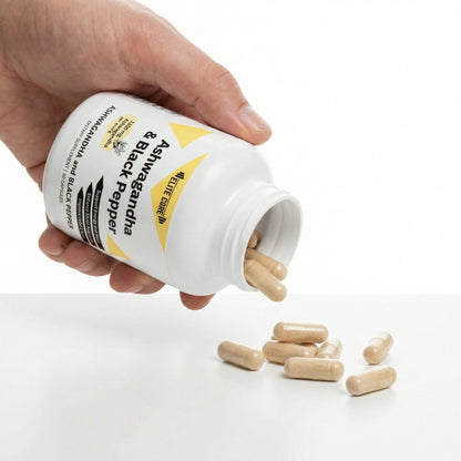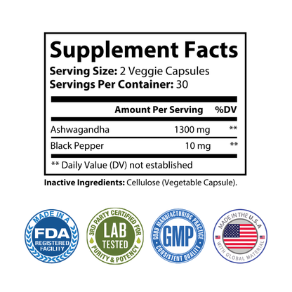 Ingredients: Ashwagandha, Black Pepper. Inactive Ingredients: Cellulose (Vegetable Capsule).