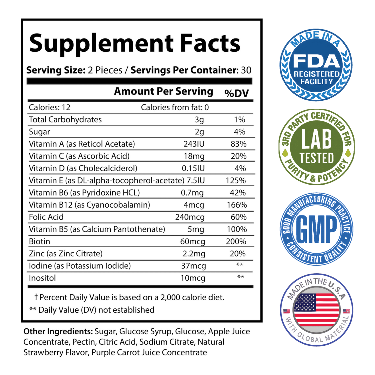 Ingredients: Vitamin A (as Reticol Acetate), Vitamin C (as Ascorbic Acid), Vitamin D (as Cholecalciderol), Vitamin E (as DL-alpha-tocopherol-acetate), Vitamin B6 (as Pyridoxine HCL), Vitamin B12 (as Cyanocobalamin), Folic Acid, Vitamin B5 (as Calcium Pantothenate), Biotin, Zinc (as Zinc Citrate), Iodine (as Potassium Iodide), Inositol. Other Ingredients: Sugar, Glucose Syrup, Glucose, Apple Juice Concentrate, Pectin, Citric Acid, Sodium Citrate, Natural Strawberry Flavor, Purple Carrot Juice Concentrate